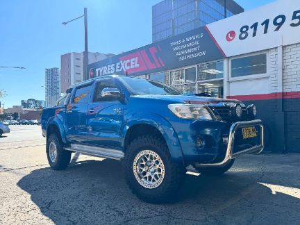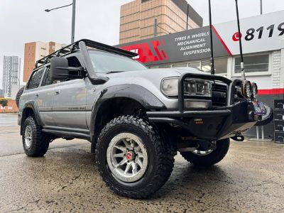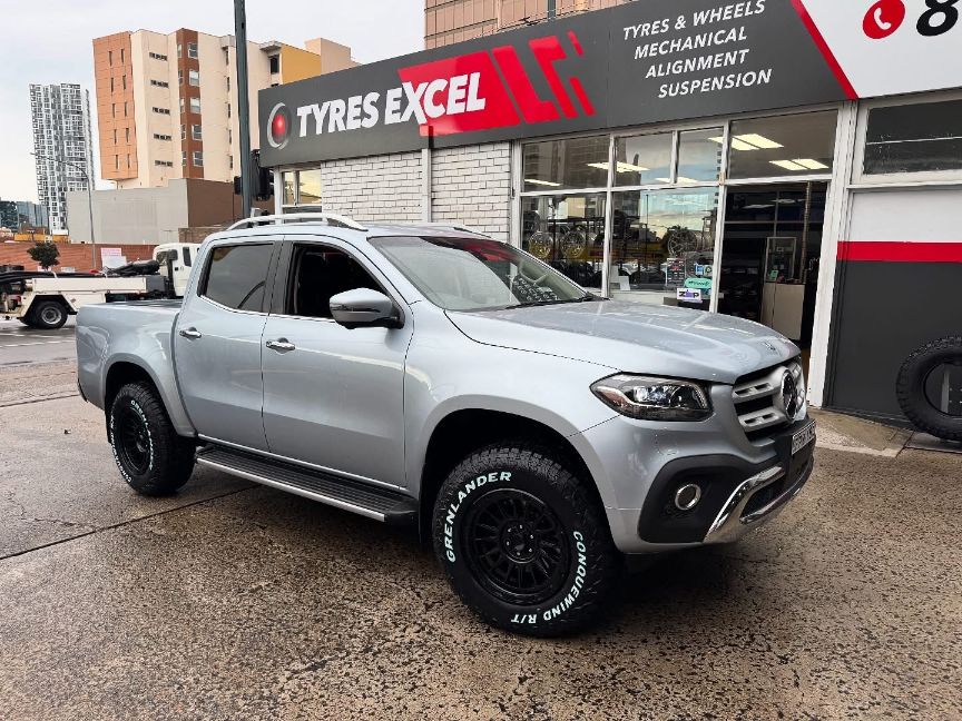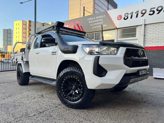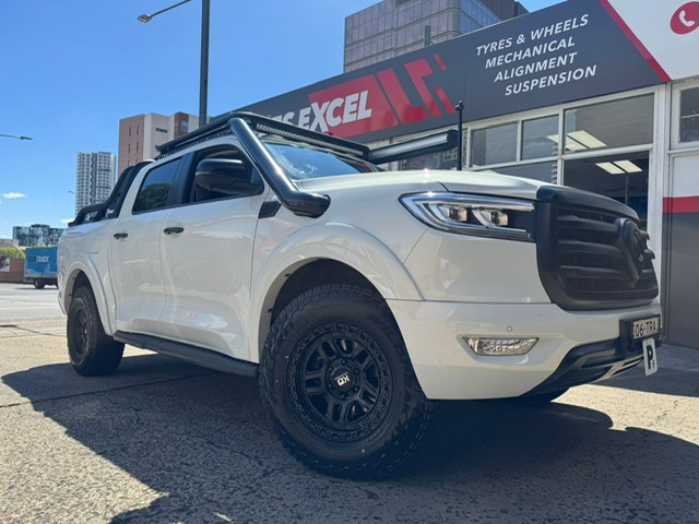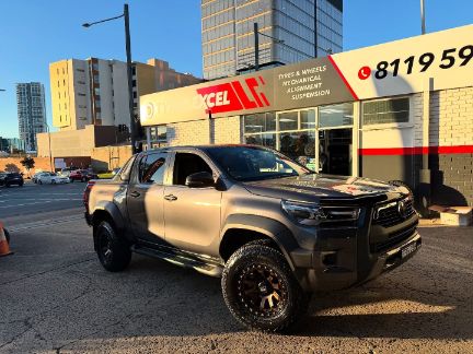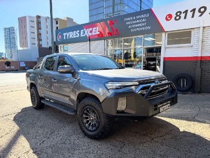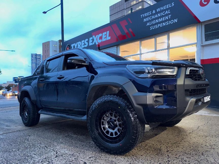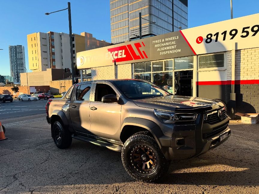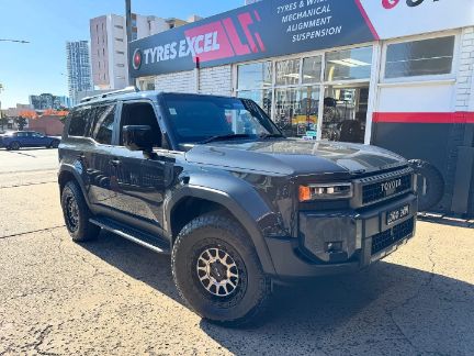 Black Toyota LandCruiser 300 Series with bronze off-road wheels outside Tyres Excel.