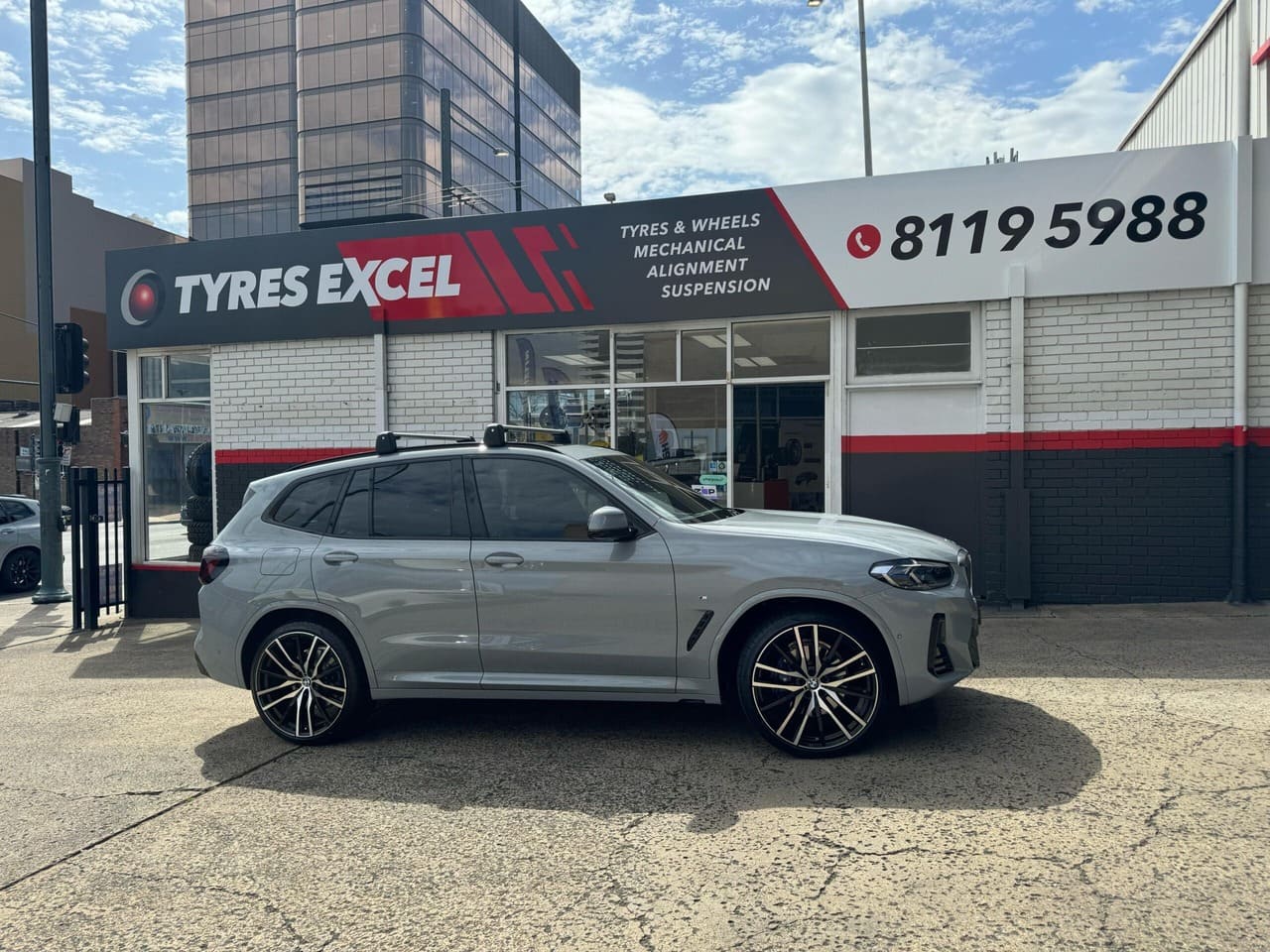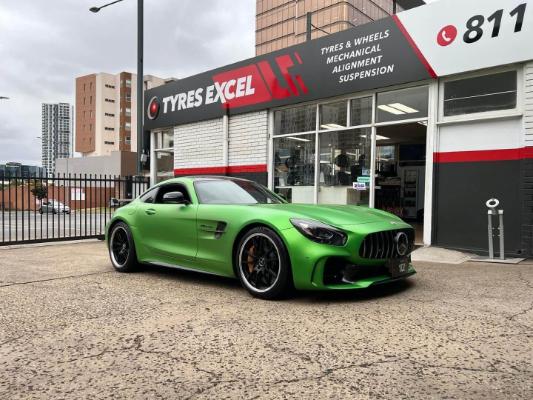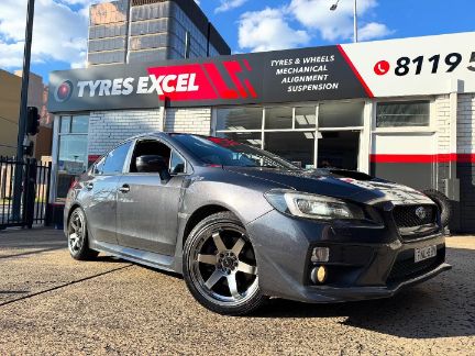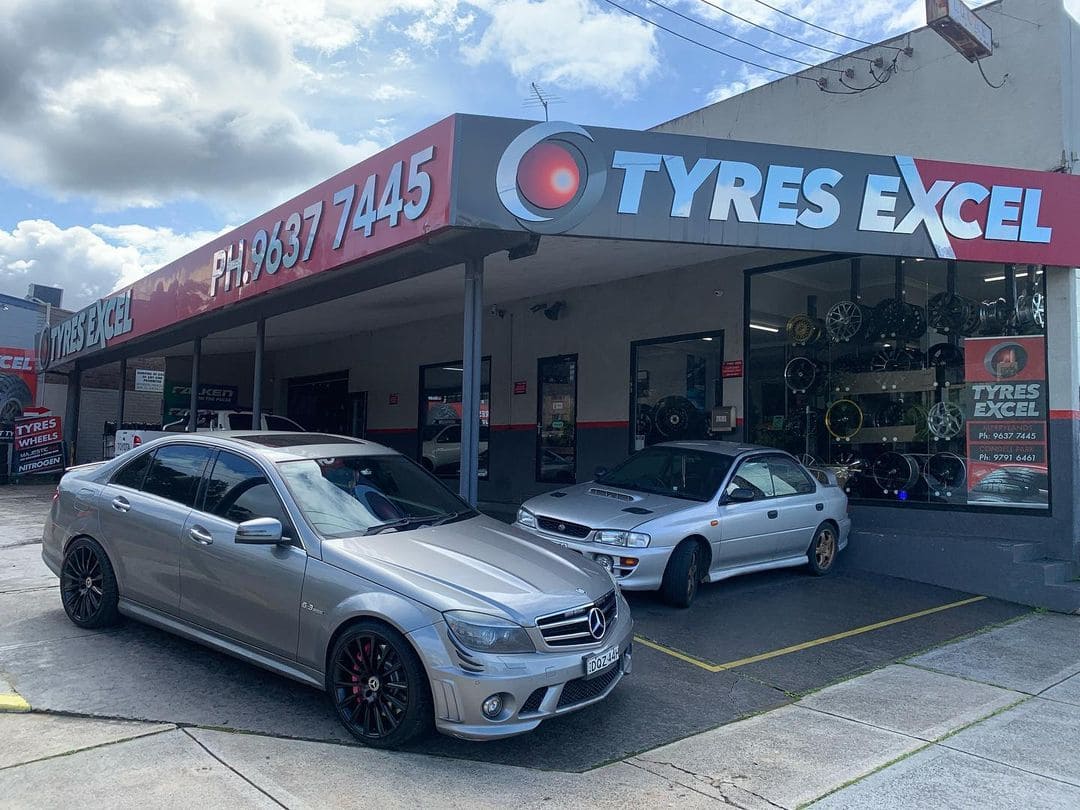 Silver Mercedes C63 AMG and Subaru WRX parked at Tyres Excel wheel shop.