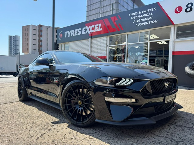 Red Holden Commodore HSV with black performance wheels outside Tyres Excel.